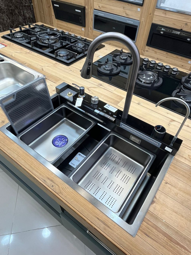 سینک آشپزخانه پیانویی ۵کلید برند هوآدیاو، توکار، دارای سیفون و زیرآب اتوماتیک، دارای شیر آب سه حالته، شیر تصفیه، دارای نمایشگر دیجیتال دمای آب وتایمر نشانگر مصرف آب ، سبد، تخته گوشت،سینی،جامایع، طرح بدنه زنبوری، رویه استیل ۳۰۴ رنگ مشکی، کره ای ، دارای لیوان شور ،کیفیت تضمینی درجه یک، ارسال به کل کشور انجام میشود